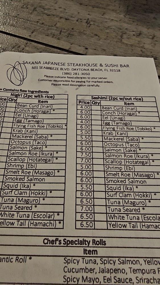 Welcome to Sakana Japanese Steakhouse & Sushi Bar, a culinary gem in Daytona Beach! Located right on Seabreeze Blvd, our vibrant restaurant offers an exceptional dining experience with a diverse menu featuring grilled meats, fresh sushi, and delectable teppanyaki. Enjoy a relaxed atmosphere perfect for families, groups, or solo dining. We pride ourselves on quick service, a wide selection of teas, and delicious options for vegetarians. With amenities like takeout, delivery, and accessible facilities, Sakana is committed to providing a memorable meal for everyone. Join us for lunch or dinner and savor the flavors of Japan today!